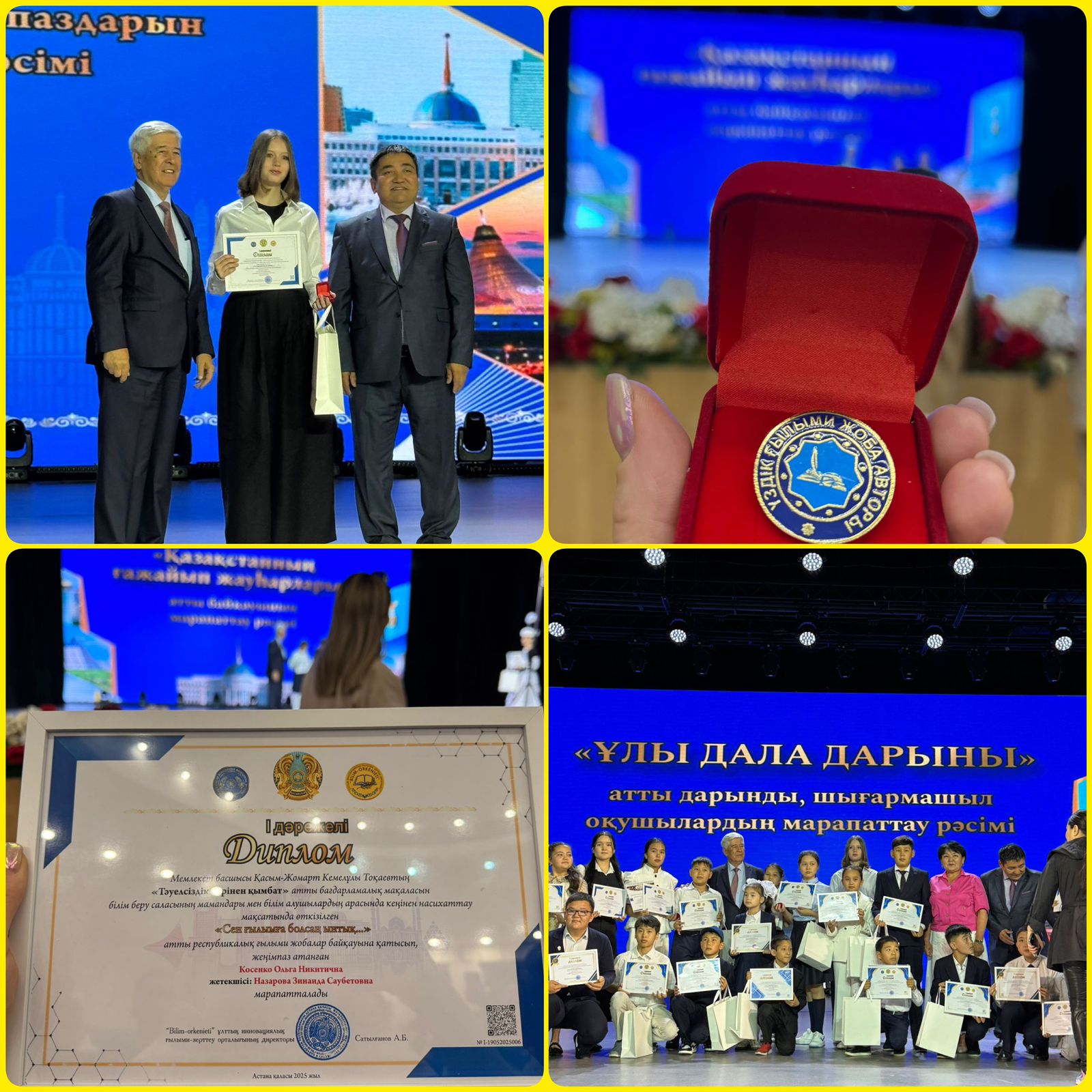 Была награждена ученица 8 «В» класса школы №55 города Алматы Косенко Ольга, ставшая победителем республиканского конкурса научных проектов «Если ты стремишься к науке», а также её руководитель — учитель физики Назарова З.С.