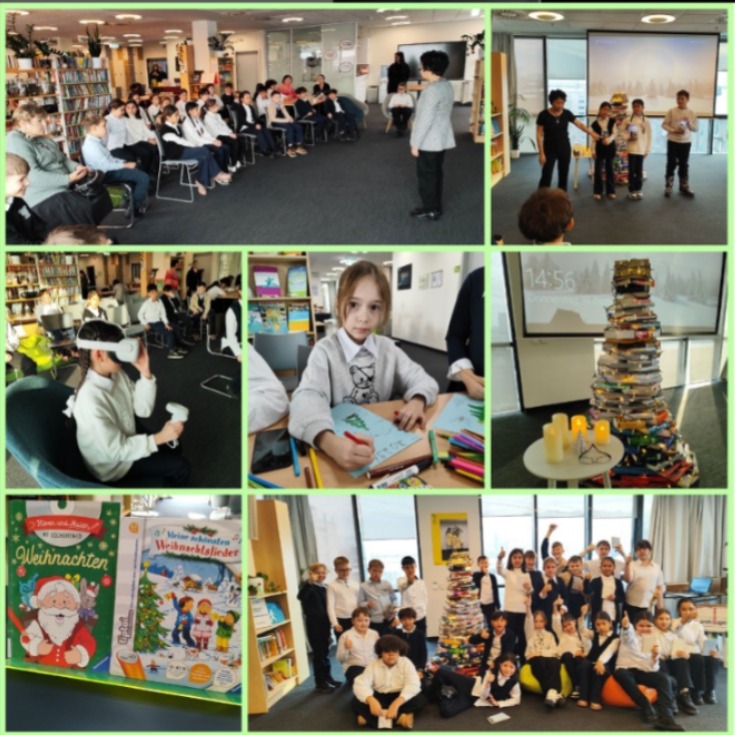27.12.2024г. учащиеся 4 “А” класса ( классный руководитель :Угодникова Н. Ф.) посетили библиотеку Goethe lnstitut в Казахстане. Познакомилась с традициями празднования Нового года в Германии, VR-проектом, Kinderuni / детским университетом. Из бумаги делали елочки и отвечали на вопросы викторины.