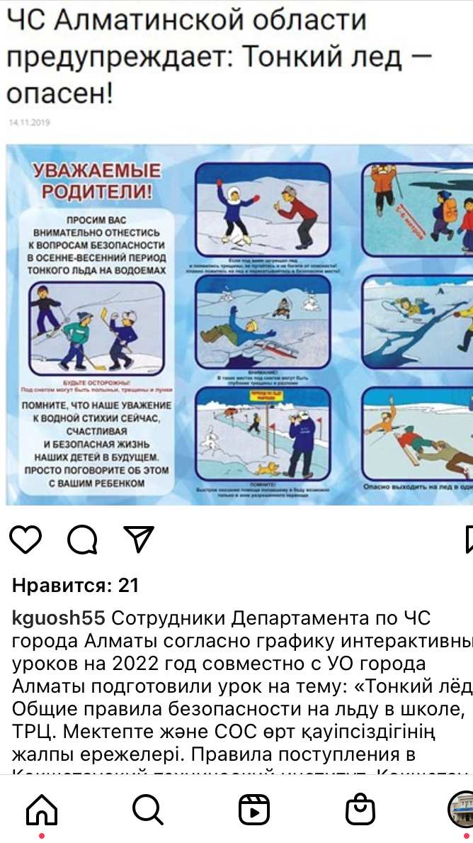 24 январь 2022 0 1 2 3 4 5 ЧС предупреждает: Тонкий лед- опасен! Сотрудники Департамента по ЧС города Алматы согласно графику интерактивных уроков на 2022 год совместно с УО города Алматы подготовили урок на тему: "Тонкий лед. Общие правила безопасности на льду в школе, ТРЦ".