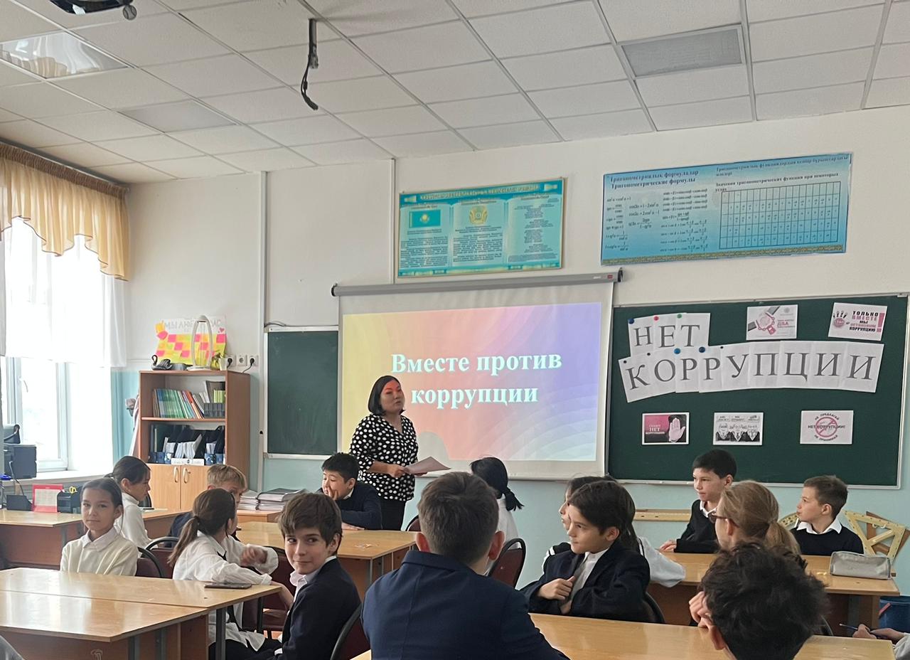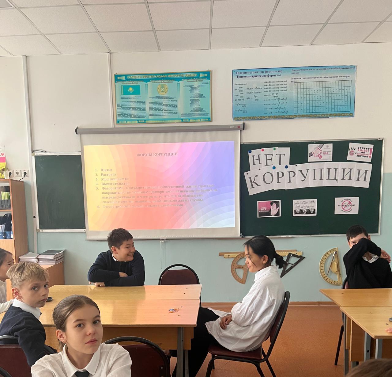 По случаю Международного дня борьбы с коррупцией 5 «А» класс с классным руководителем Кожахметовой Анар Балтабековной провели классный час по повышению осведомленности о разрушающем действии коррупции. Целью классного часа было воспитать ответственность за собственные действия и поступки; привить подрастающему поколению негативное отношение к коррупционным действиям, а также научить противостоять коррупции!
