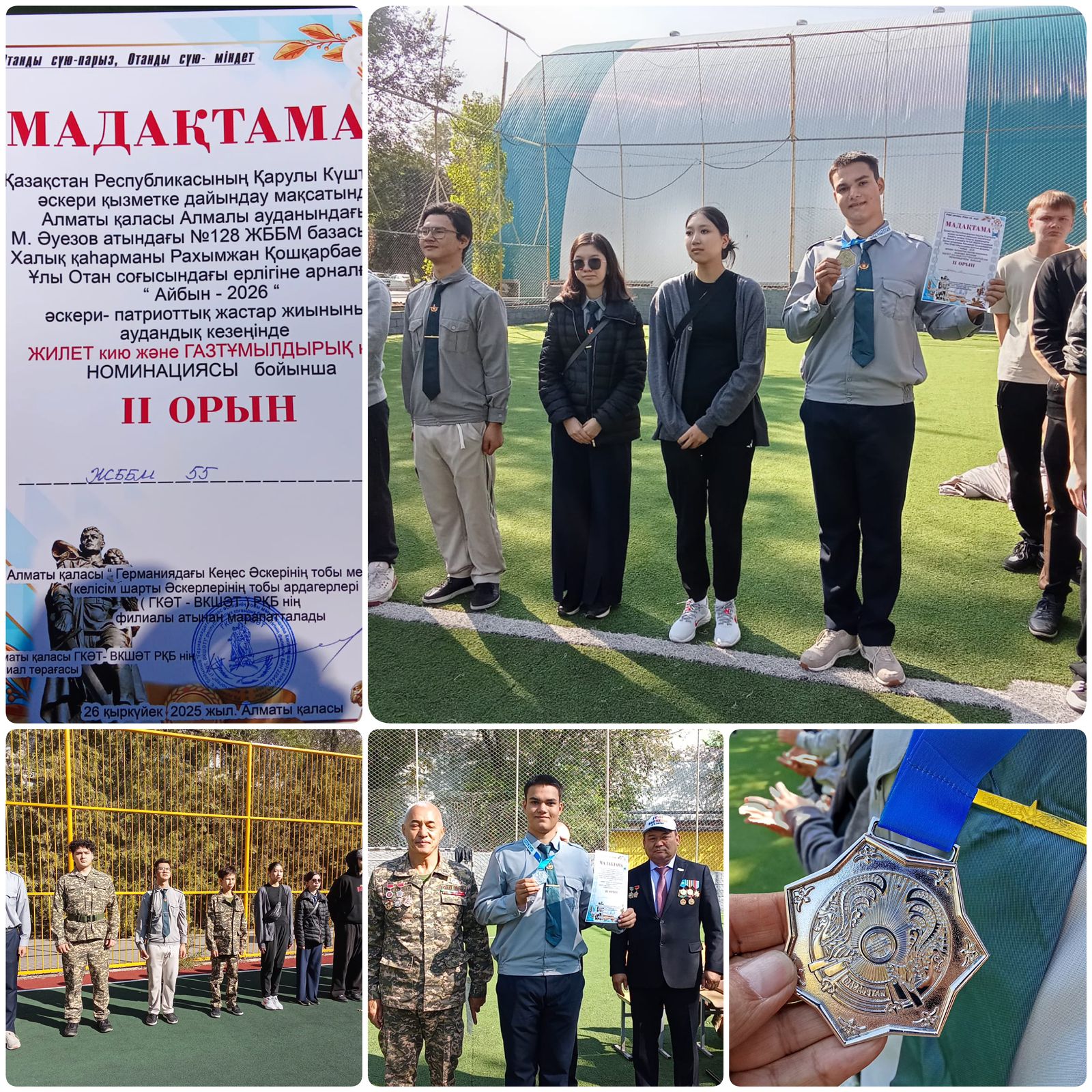 04 октября 2025 года ученики с 9 по 11 класса КГУ «ОШ № 55» участвовали в районном этапе военно-патриотического сбора молодёжи «Айбын-2026» в эстафете , посвященной подвигу «Халық қаһарманы» Рахимжана Кошкарбаева в Великой Отечественной войне и заняли 2 место по надеванию снаряжения.