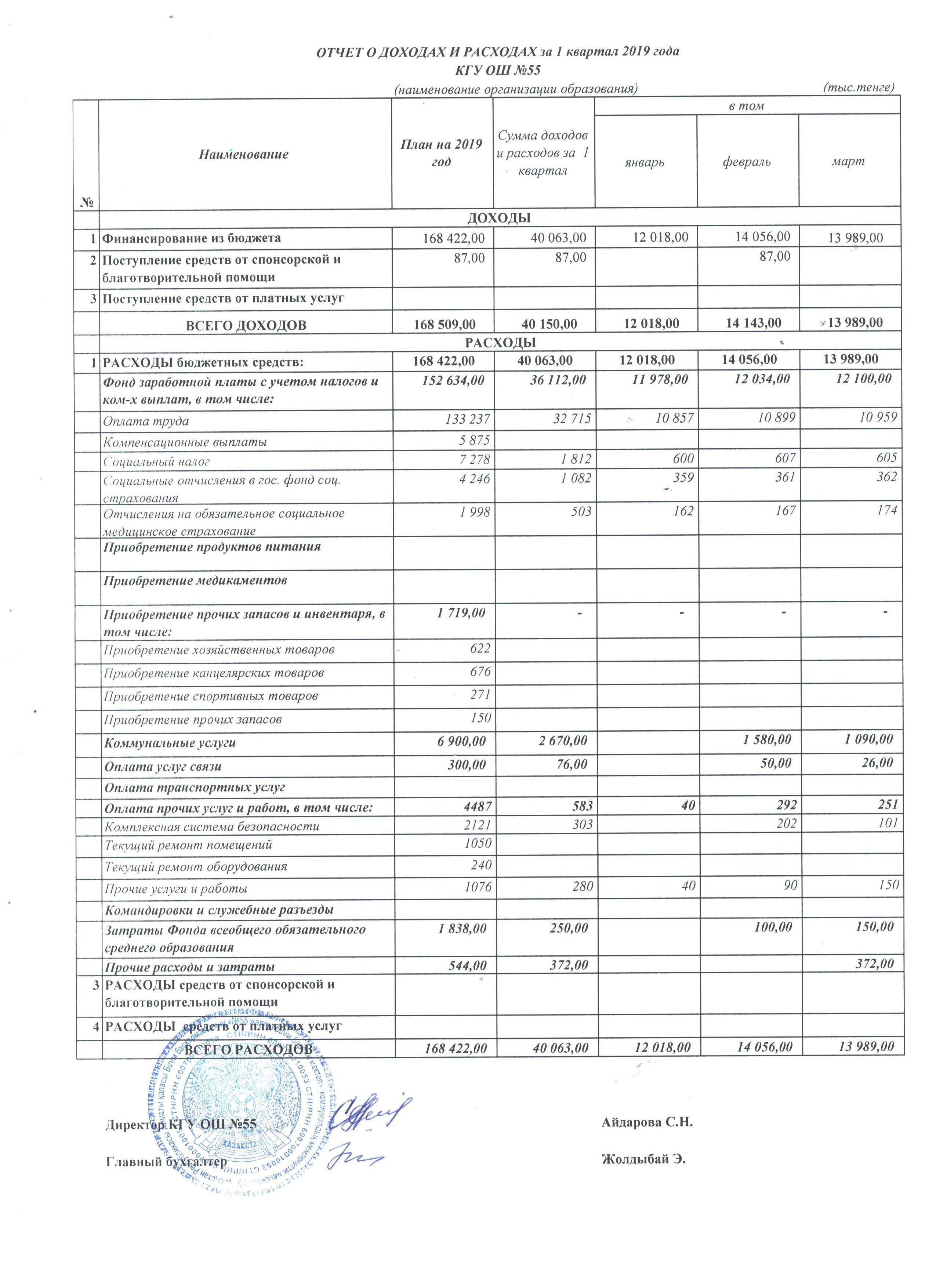 Отчет о доходах и расходах за 1 квартал 2018 года по КГУ ОШ №55