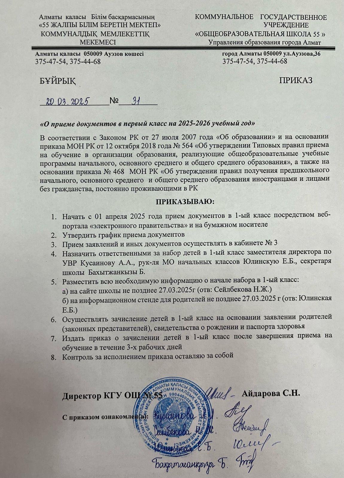 20 март 2025 0 1 2 3 4 5 2025–2026 оқу жылына 1-сыныпқа қабылдау туралы бұйрық. Приказ о приеме в первый класс на 2025-2026 уч.год Приказ о приеме в первый класс на 2025-2026 уч.год
