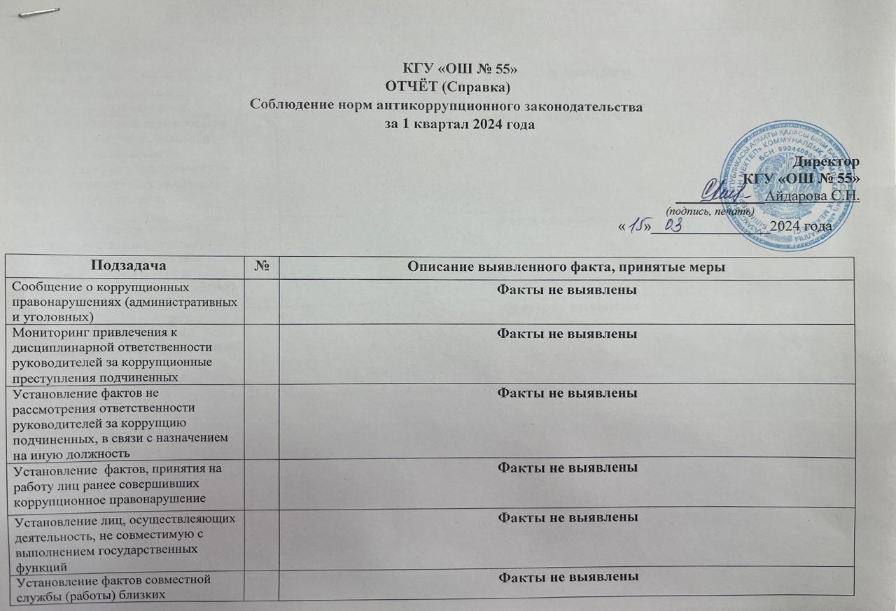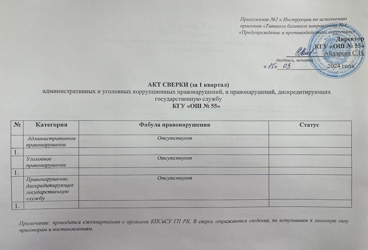 15 март 2024 0 1 2 3 4 5 Акт сверки (за 1 квартал) административных и уголовных коррупционных правонарушений, и правонарушений, дискредитирующих государтсвенную службу Акт сверки (за 1 квартал) административных и уголовных коррупционных правонарушений, и правонарушений, дискредитирующих государтсвенную службуОтчет (справка) Соблюдение норм антикоррупционного законодательства за 1 квартал 2024 года