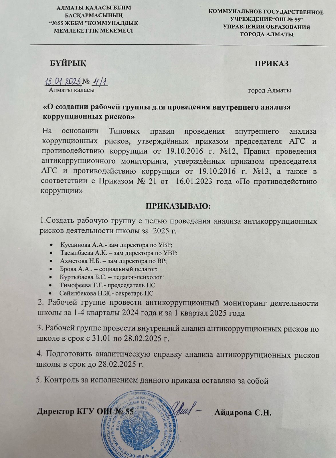 «Сыбайлас жемқорлық тәуекелдеріне ішкі талдау жүргізу жөніндегі жұмыс тобын құру туралы» бұйрық. Приказ "О создании рабочей группы для проведения внутреннего анализа коррупционных рисков"