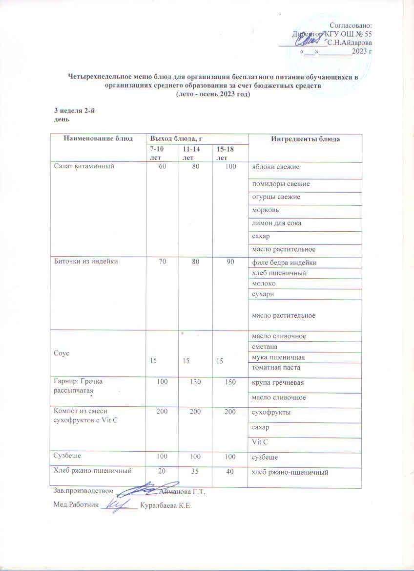 19 сентябрь 2023 0 1 2 3 4 5 3 апта 2 күн. Тегін тамақтануды ұйымдастыруға арналған тағамдар мәзірі (жаз - күз). 3 неделя 2 день. Меню блюд для организации бесплатного питания (лето-осень 2023 год)