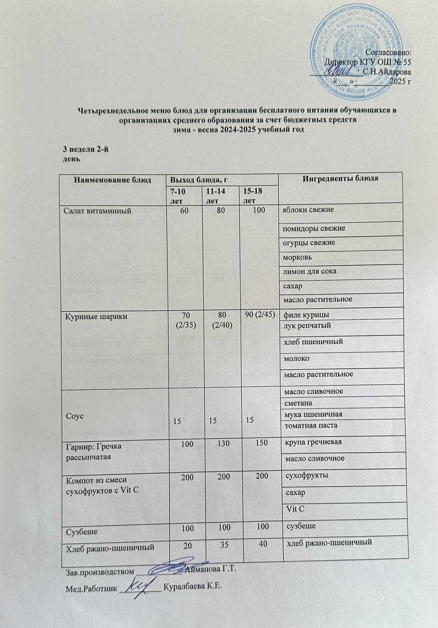 15 апрель 2025 0 1 2 3 4 5 3 апта 2 күн. Тегін тамақтануды ұйымдастыруға арналған тағамдар мәзірі (қыс-көктем). 3 неделя 2 день. Меню блюд для организации бесплатного питания (зима-весна 2025 год)