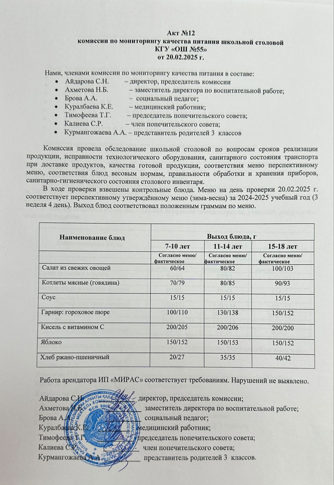 20 февраль 2025 0 1 2 3 4 5 Мектеп асханасының тамақтану сапасын мониторингілеу жөніндегі комиссияның № 12 актісі. Акт № 12 комиссии по мониторингу качества питания школьной столовой
