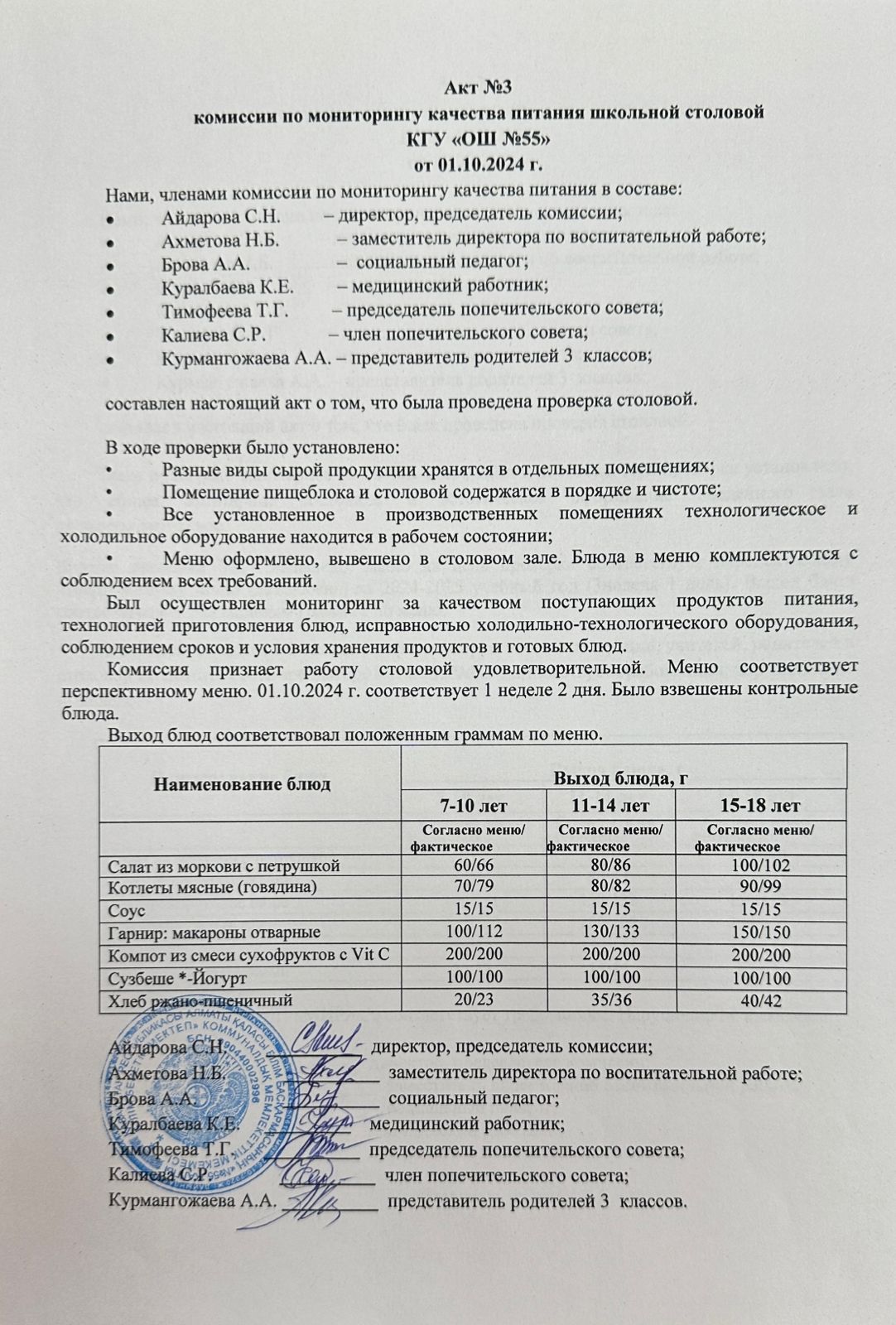 01 октябрь 2024 0 1 2 3 4 5 Мектеп асханасының тамақтану сапасын мониторингілеу жөніндегі комиссияның № 3 актісі. Акт № 3 комиссии по мониторингу качества питания школьной столовой